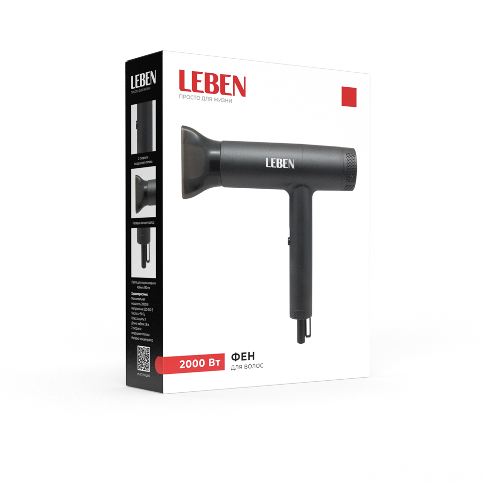 Фен LEBEN сочетает высокую мощность и эргономичность, обеспечивая быстрый и эффективный уход за волосами. Модель выполнена в графитовом цвете с матовым покрытием, что придает прибору стильный и современный вид. Мощность устройства достигает 2000 Вт, что позволяет быстро сушить волосы и укладывать их без лишних усилий. Фен оснащен 2 скоростями, благодаря чему можно подобрать оптимальный режим для любого типа волос и желаемого результата. В комплект входит концентратор, обеспечивающий точное направление воздушного потока для аккуратной и профессиональной укладки.