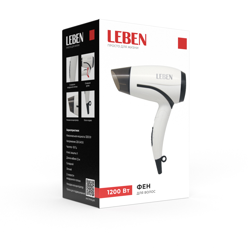 Фен LEBEN сочетает компактный складной дизайн, стильный бело-черный корпус и функциональность для комфортной сушки волос дома и в поездках. Максимальная мощность 1200 Вт обеспечивает быстрый нагрев и эффективное высушивание волос, а 2 скорости позволяют подобрать оптимальный режим для любого типа волос и желаемого результата. Модель оснащена концентратором, который направляет поток воздуха точно на нужный участок, обеспечивая аккуратную укладку. Эргономичный дизайн делает фен удобным в использовании и безопасным для повседневной эксплуатации.