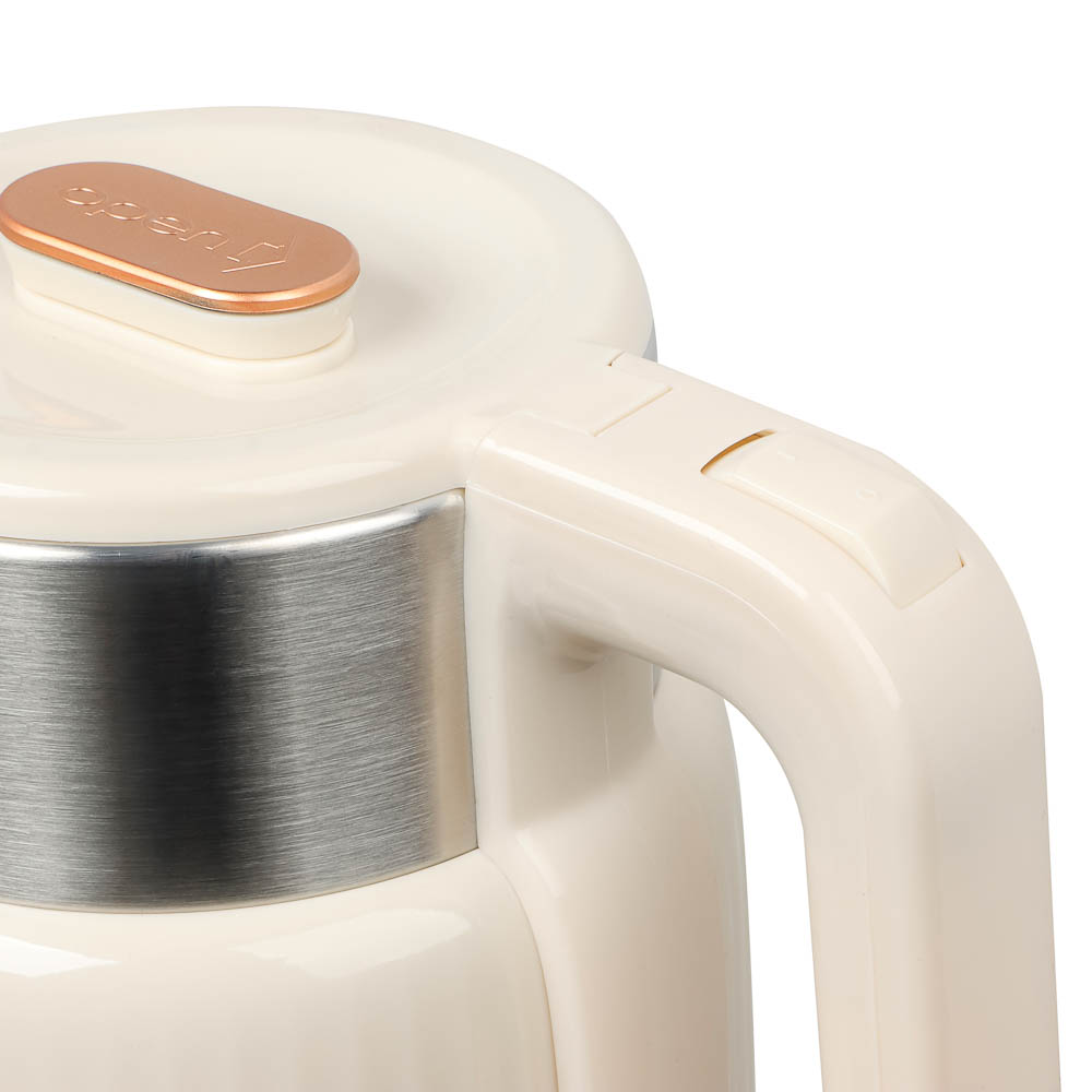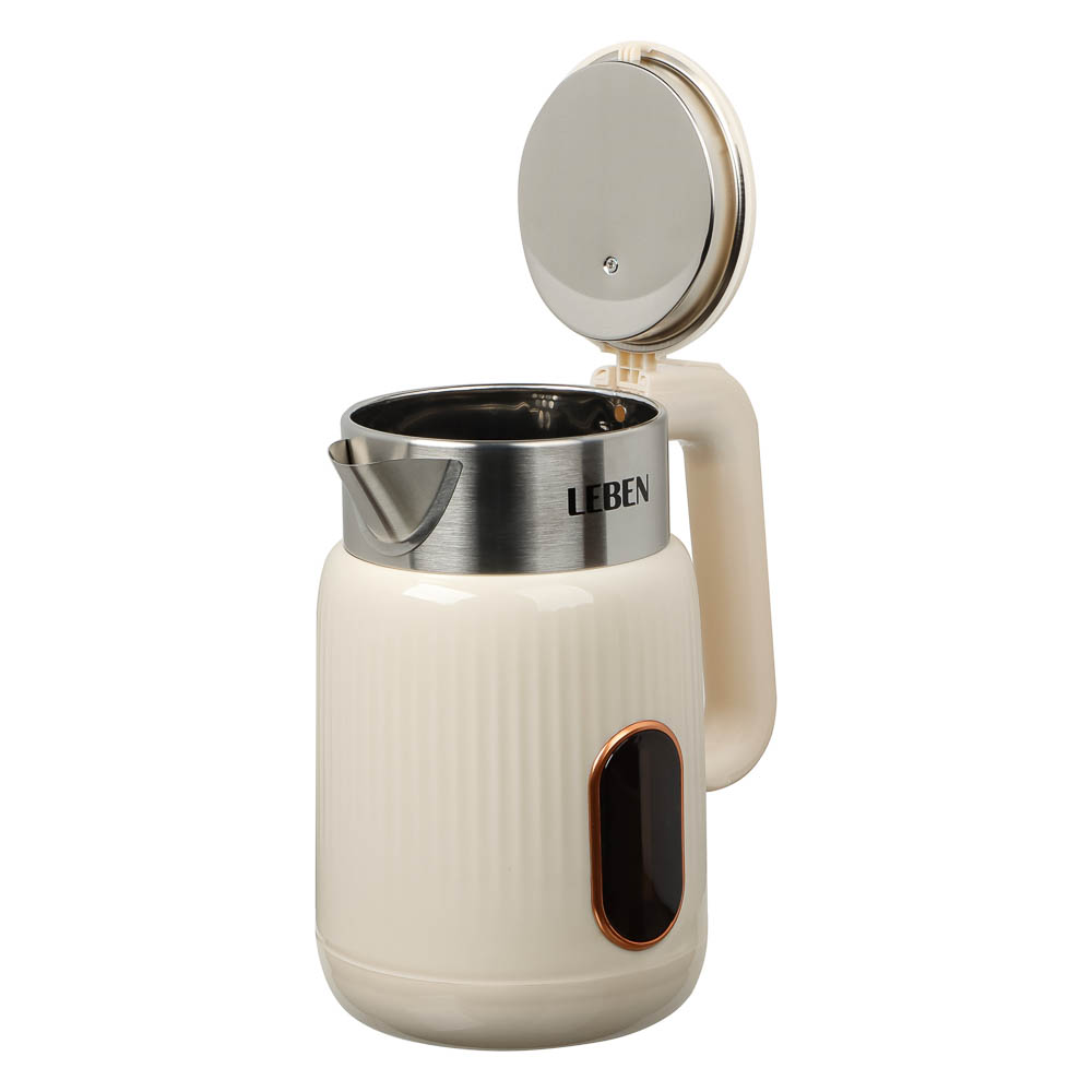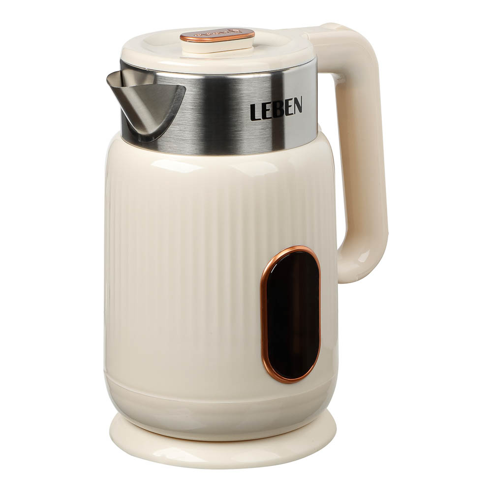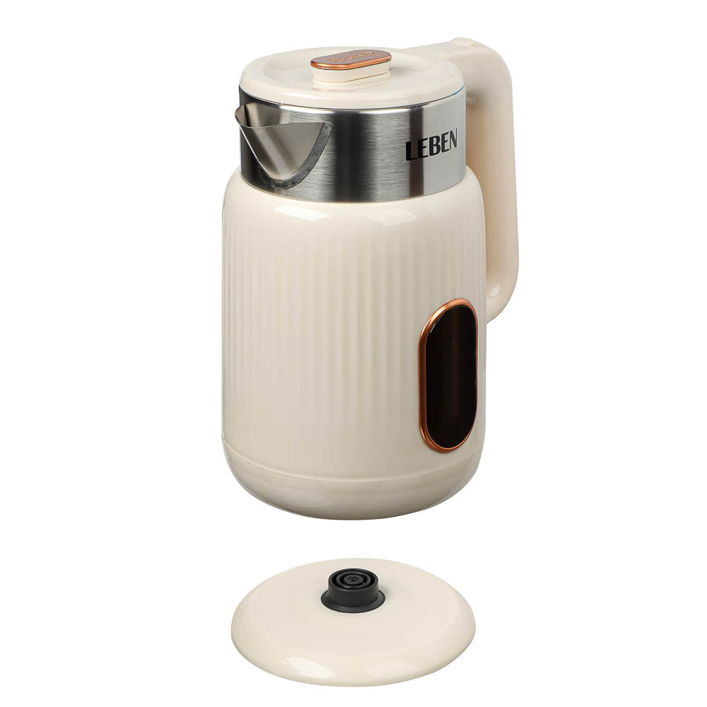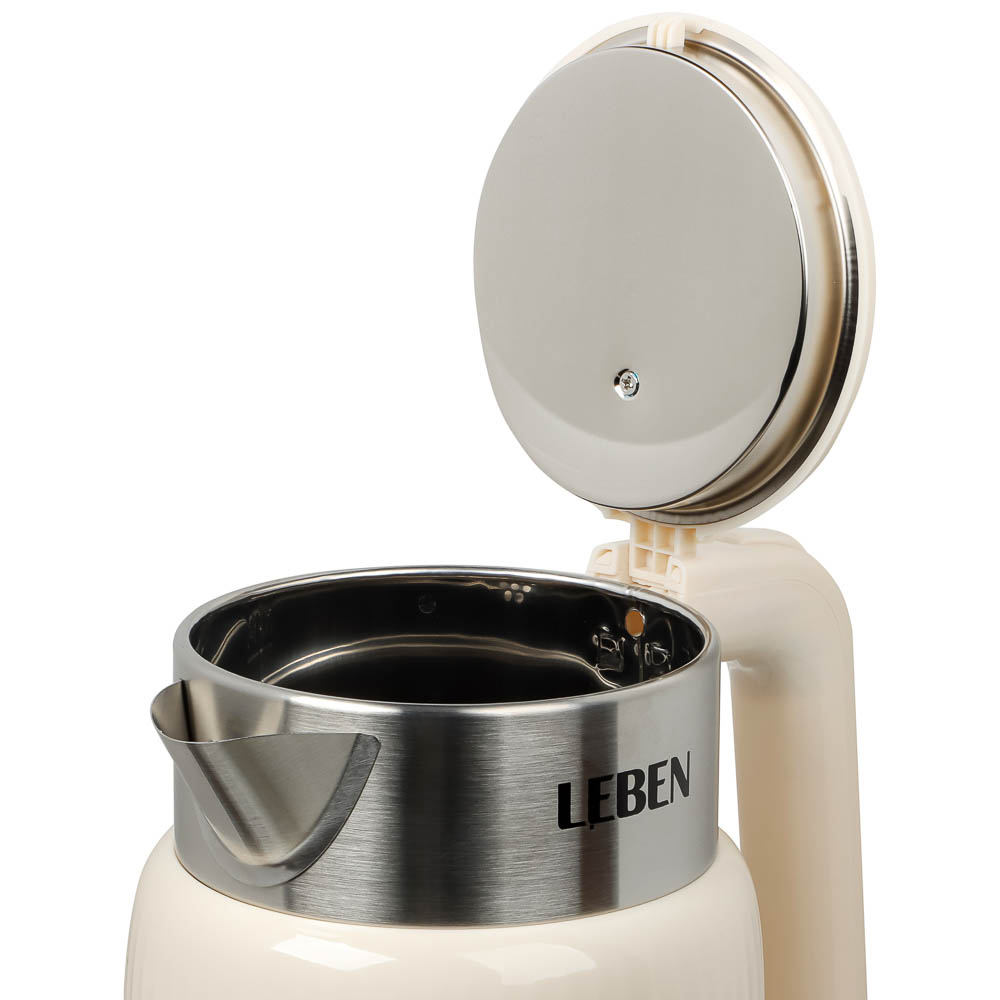 Практичный и надёжный электрический чайник LEBEN объёмом 2 литра быстро и безопасно кипятит воду благодаря мощности 1500 Вт. Корпус выполнен из качественного белого пластика, устойчивого к нагреву и лёгкого в уходе. Удобная конструкция с поворотом на 360° и скрытым нагревательным элементом делает использование комфортным и безопасным. Чайник автоматически отключается при закипании, предотвращая перегрев и экономя электроэнергию. Идеальное решение для дома или офиса — компактный, функциональный и стильный аксессуар для вашей кухни.